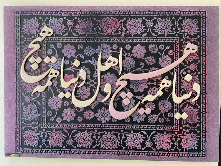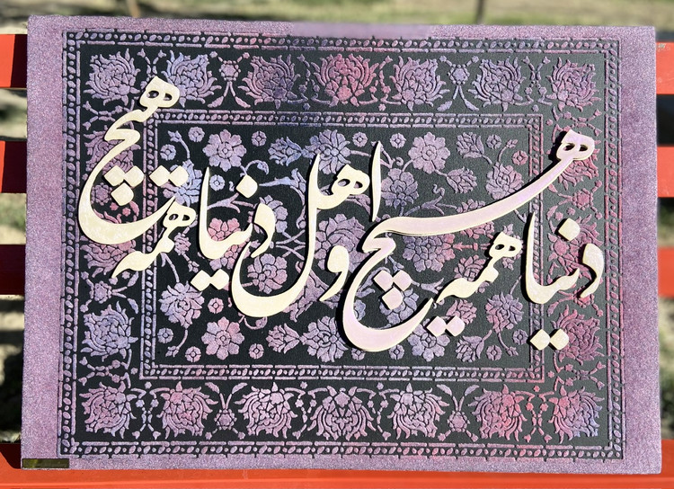 تابلوی کالیگرافی برجسته شعر "دنیا همه هیچ و اهل دنیا همه هیچ" اثر هنری دست ساز با تکنیک ترکیبی
