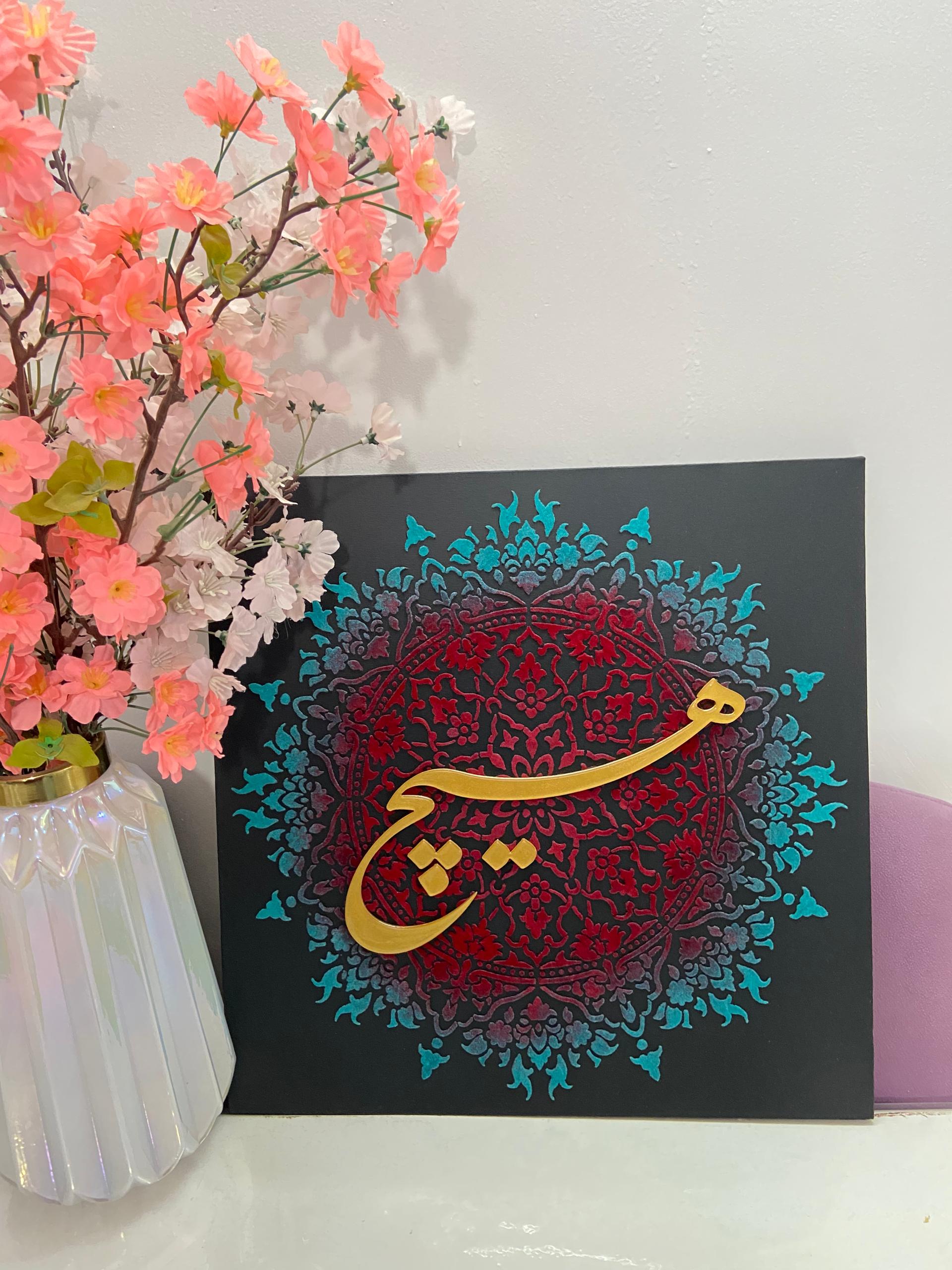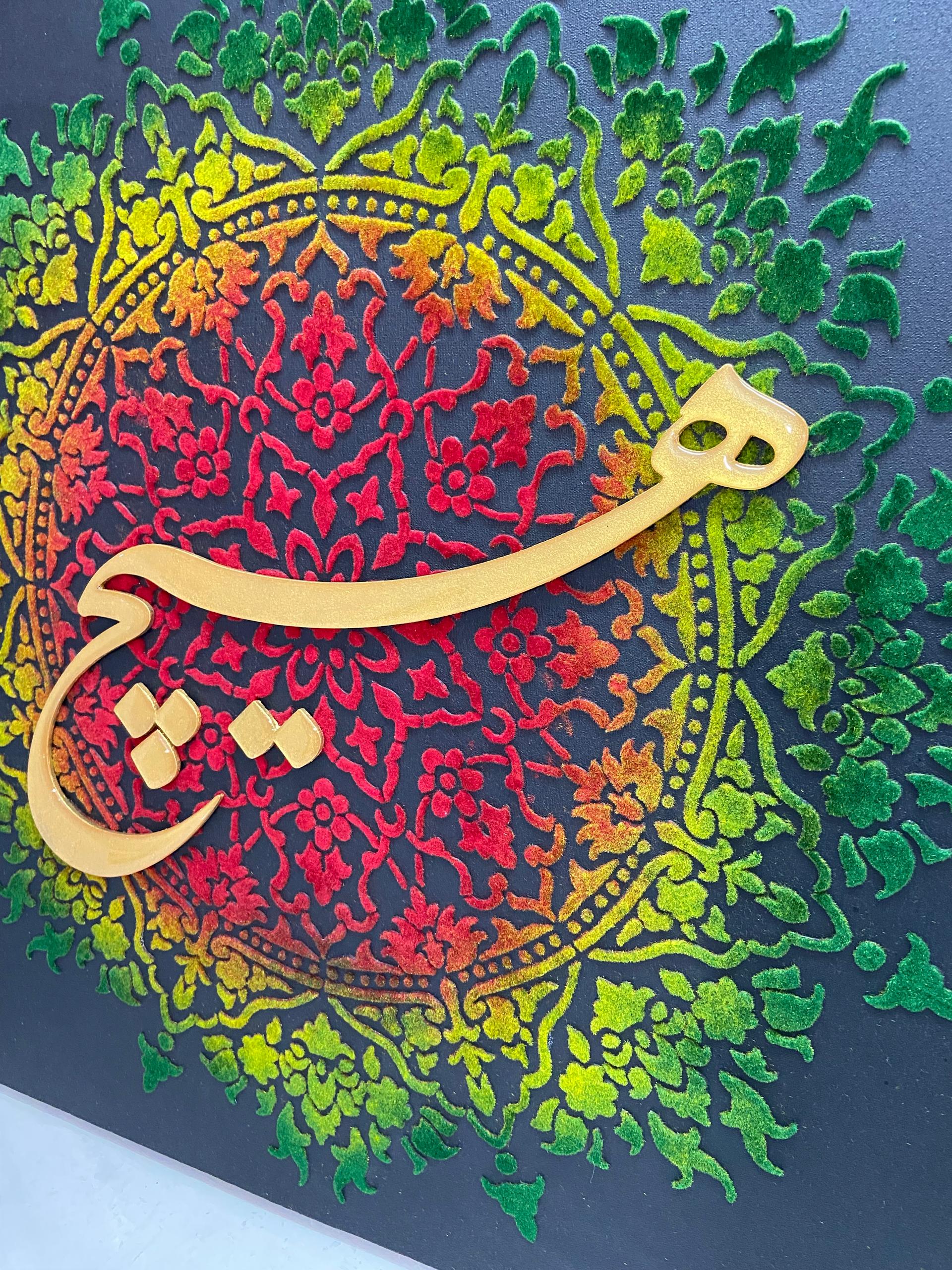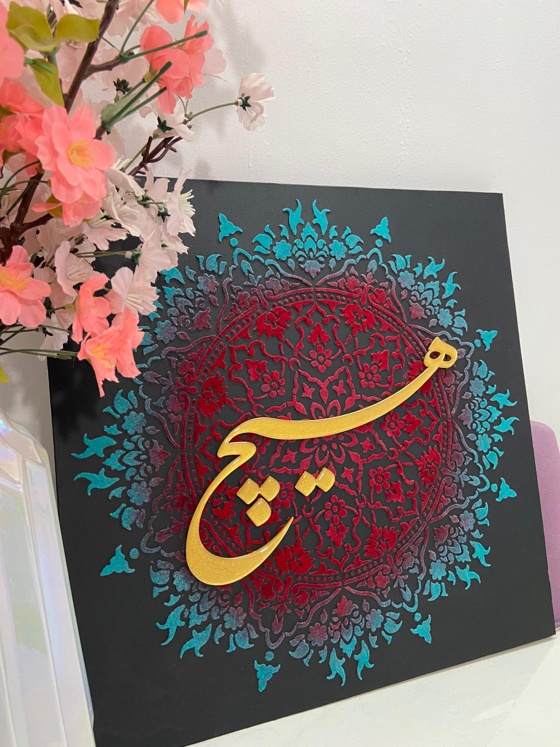 تابلو کالیگرافی برجسته با تکسچر و پودر مخمل روی بوم مرغوب پارچهای اجرا شده است. شابلون دقیق، طرح را بدون نقص منتقل کرده و بافت مخملی برجسته، جلوهای سهبعدی و لوکس به تابلو میبخشد. مناسب برای دکور منزل، محل کار یا هدیهای هنری و فاخر است.
